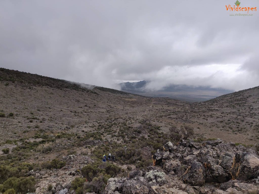 it was a long walk today going up steep path few times over the Shira ridge and finally a gentle down to Shira 1 camp, our first glimpse of Kibo across the plateau.